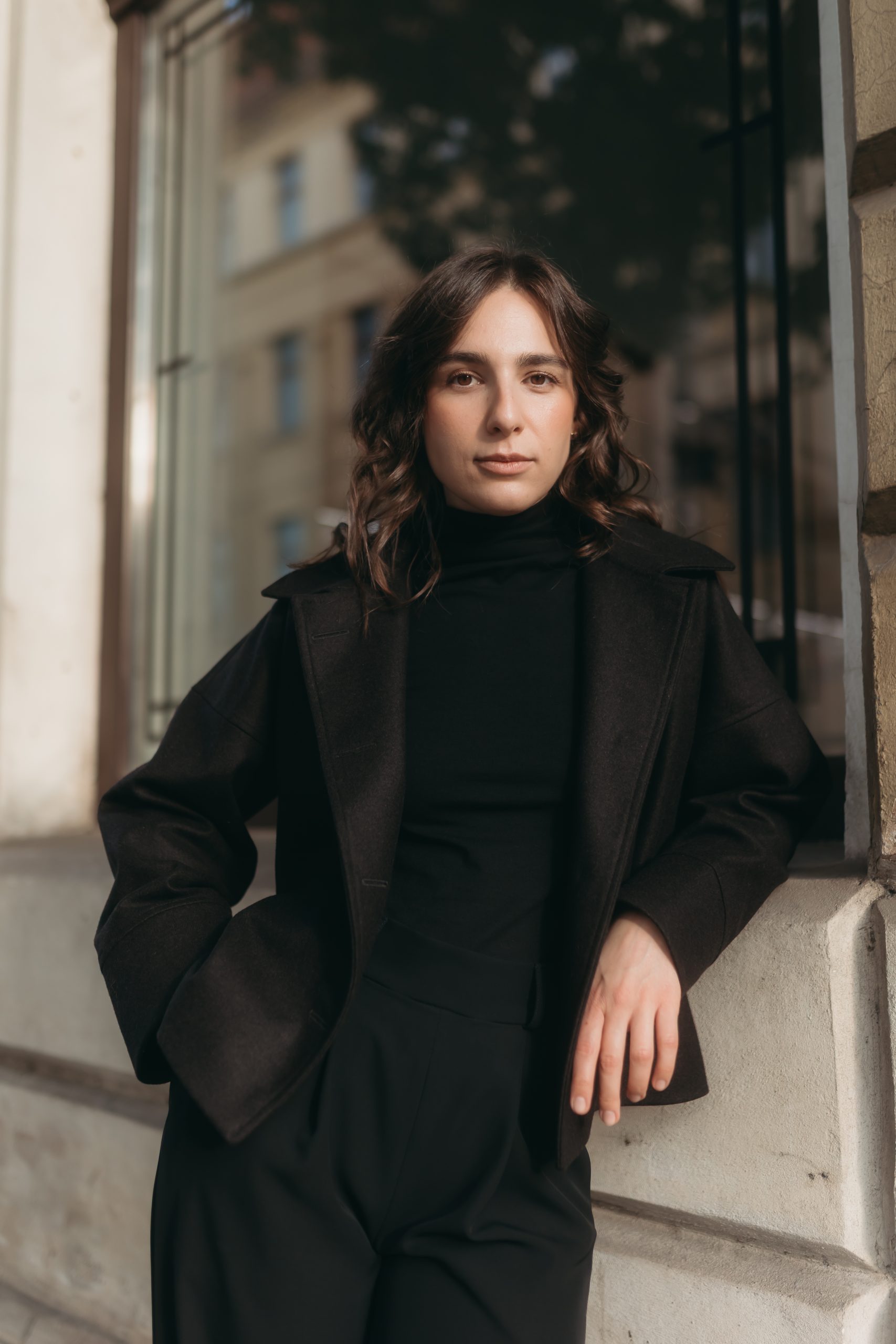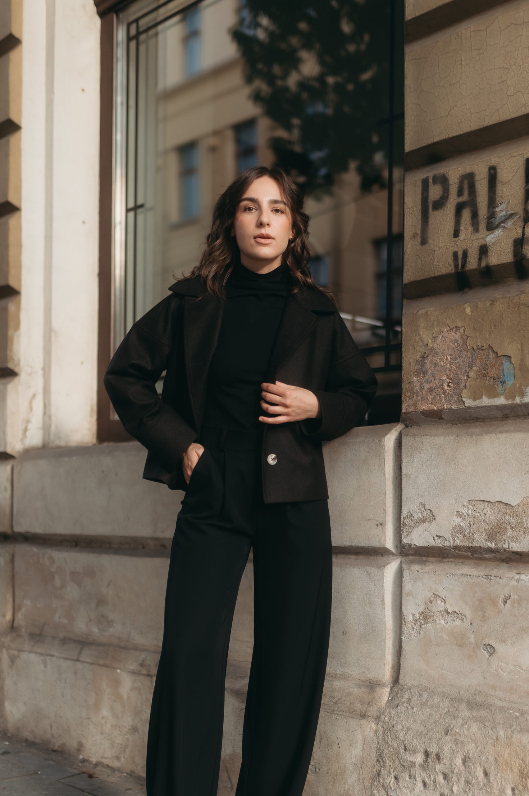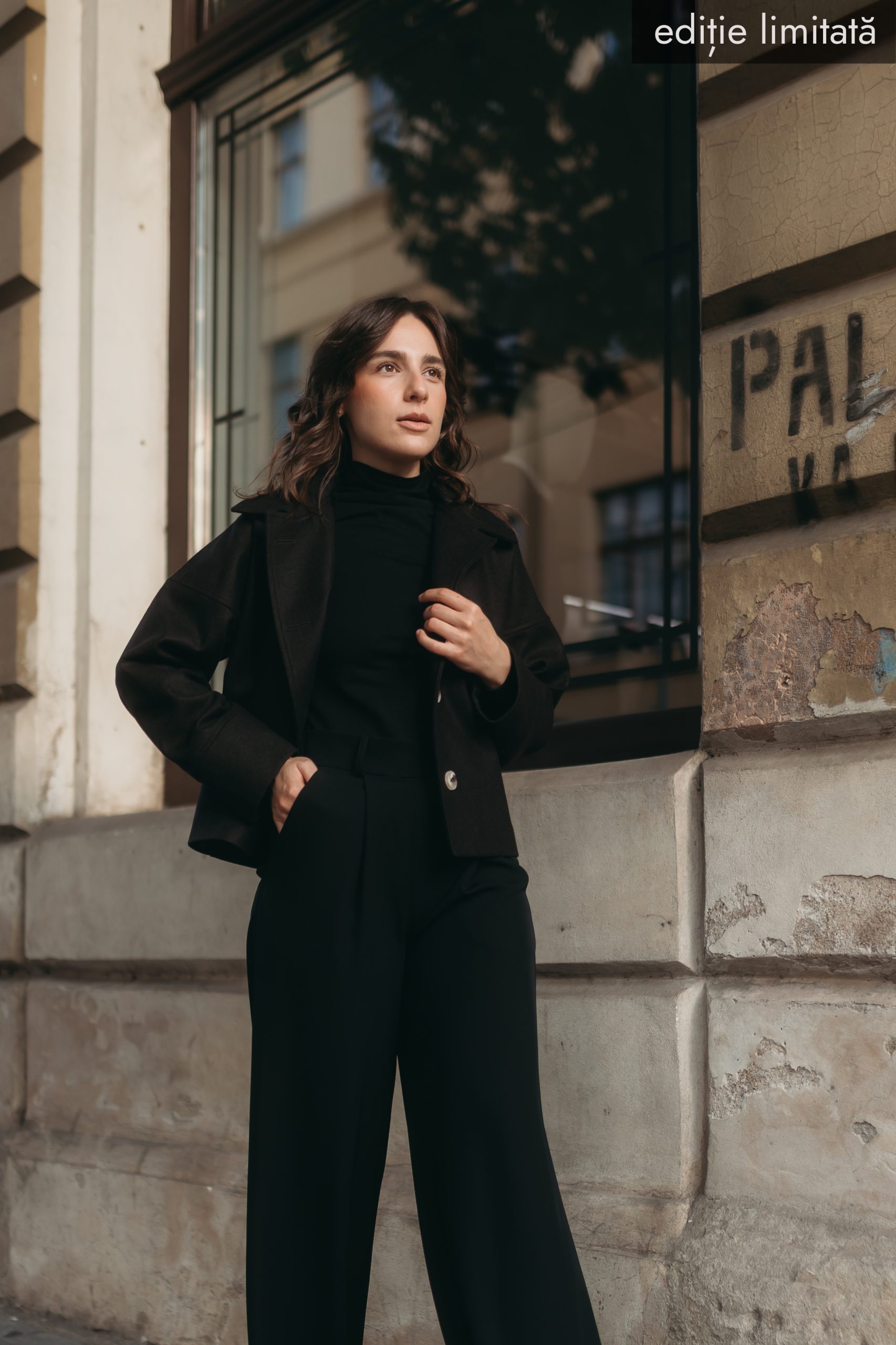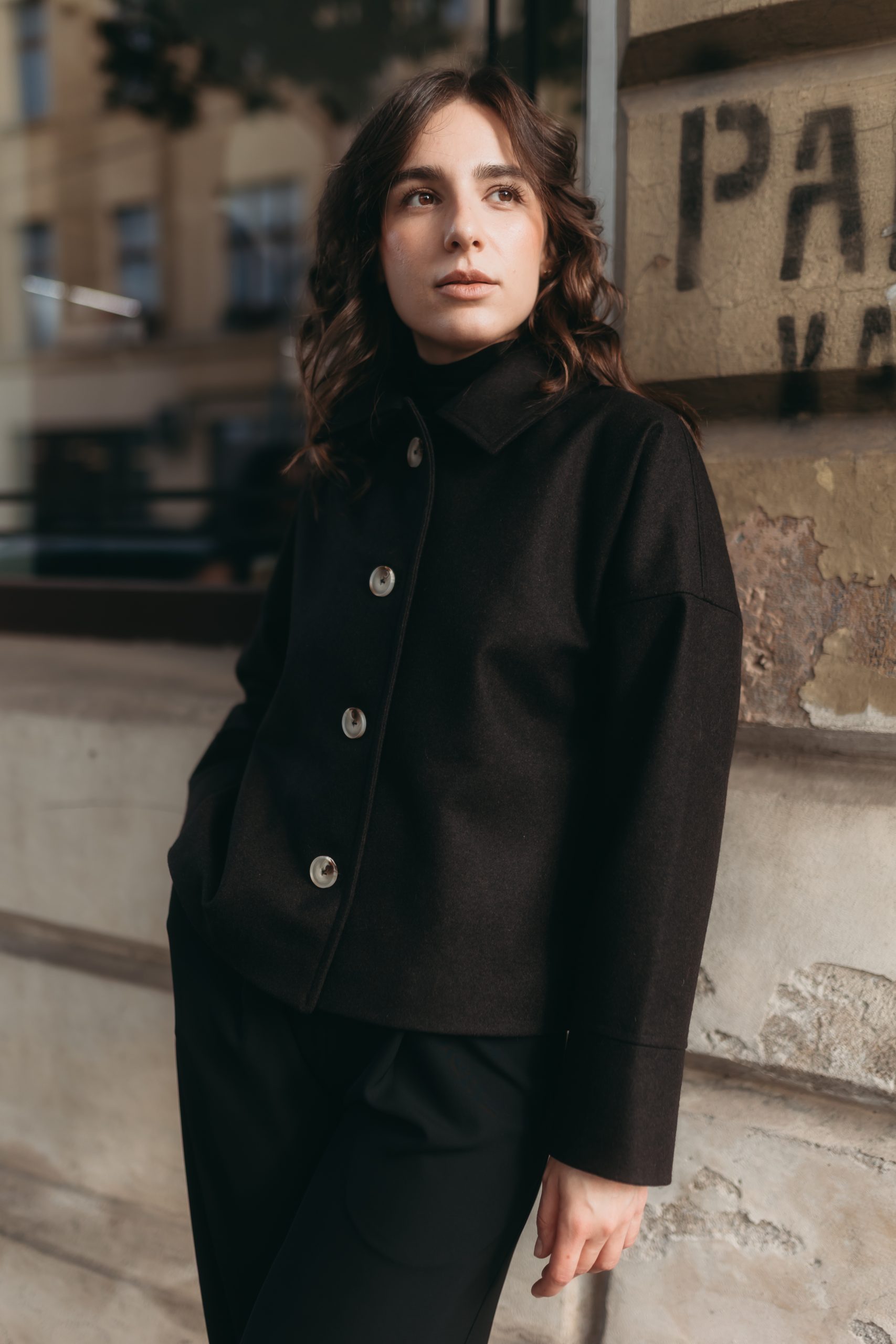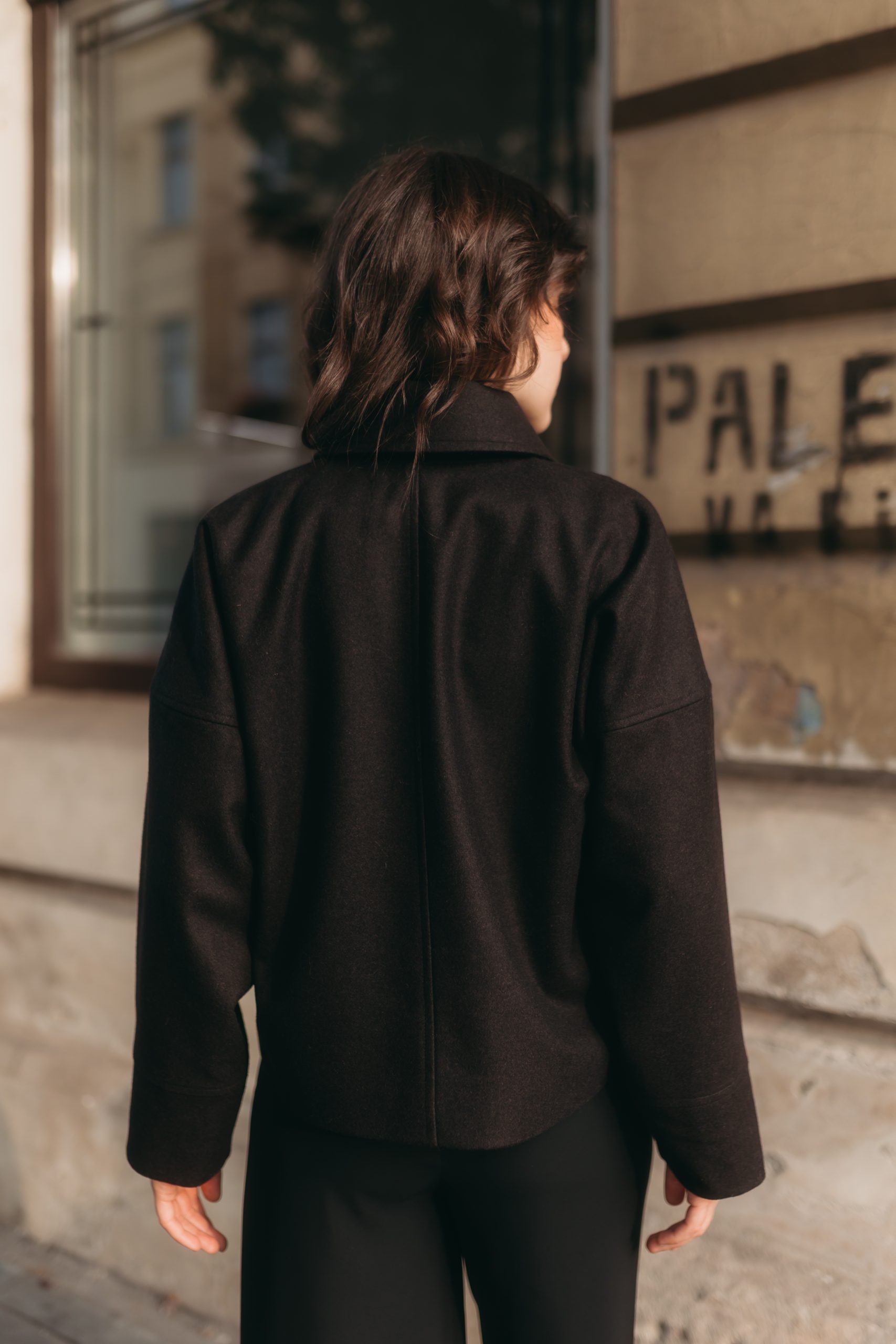 Palton scurt cu croi lejer, din stofă postav 100% lână, dublat cu căptușeală simplă, creat sustenabil în atelierul nostru.