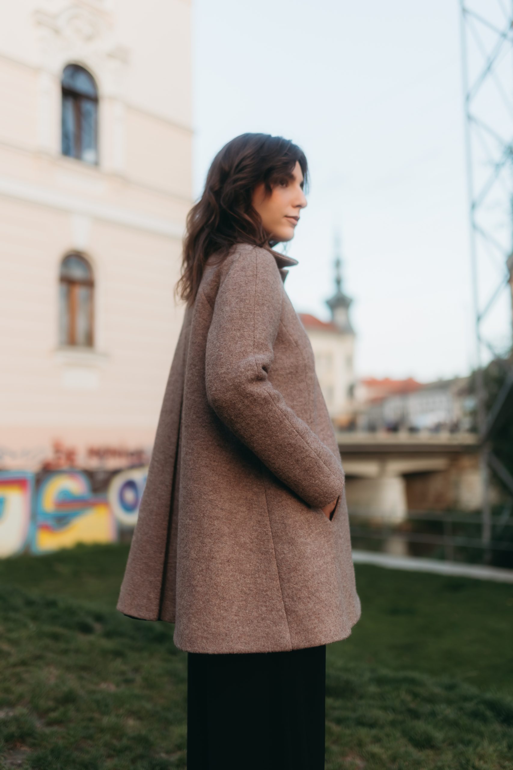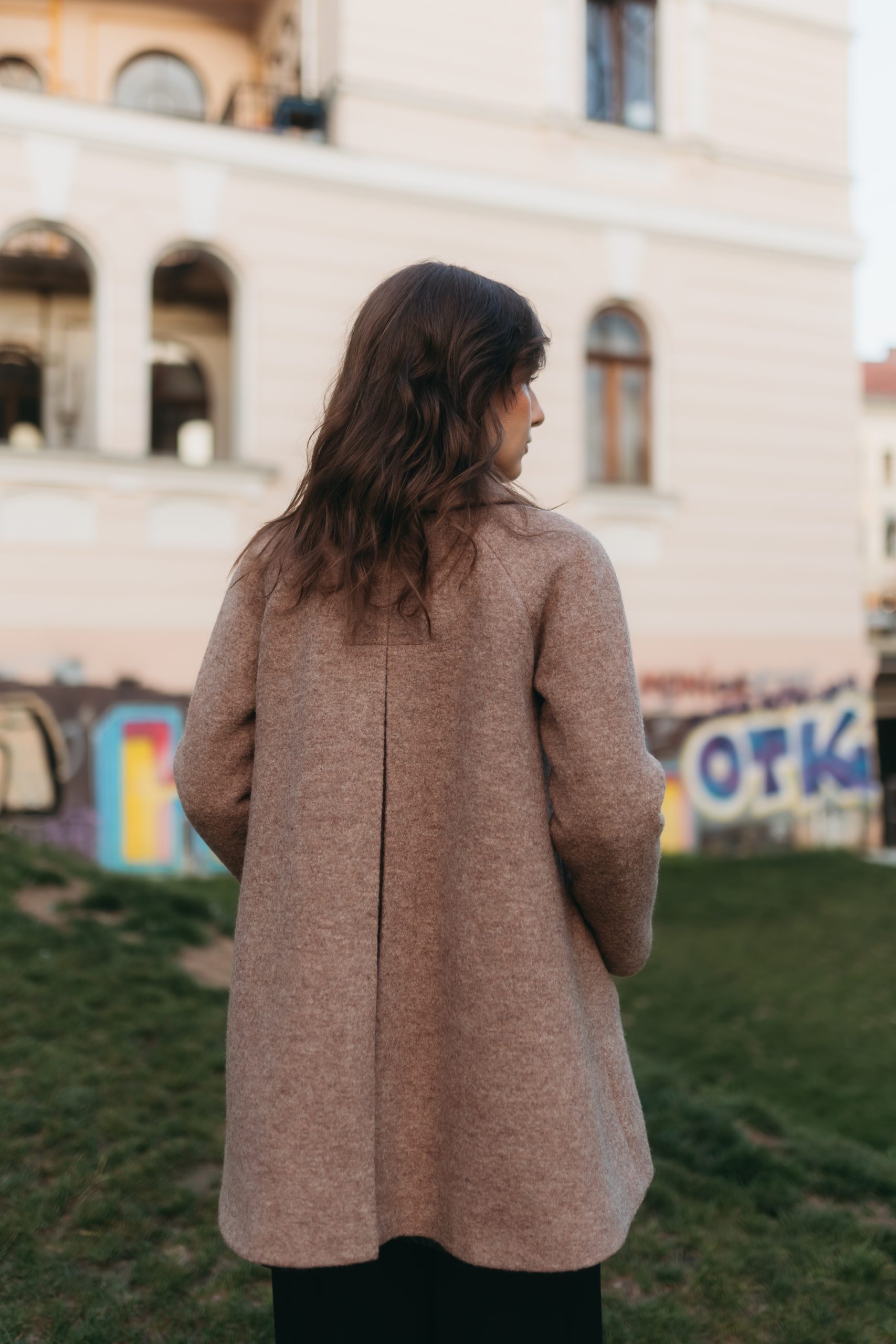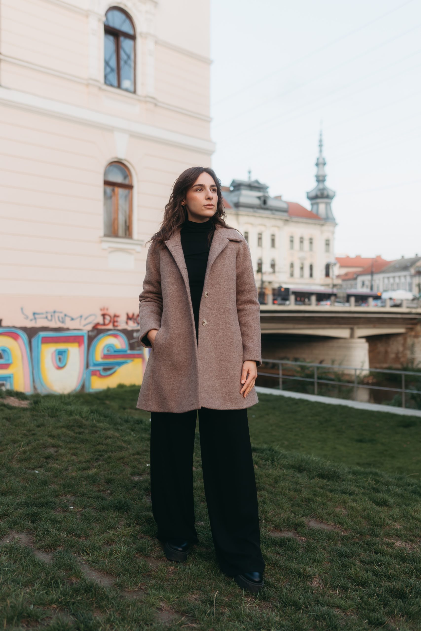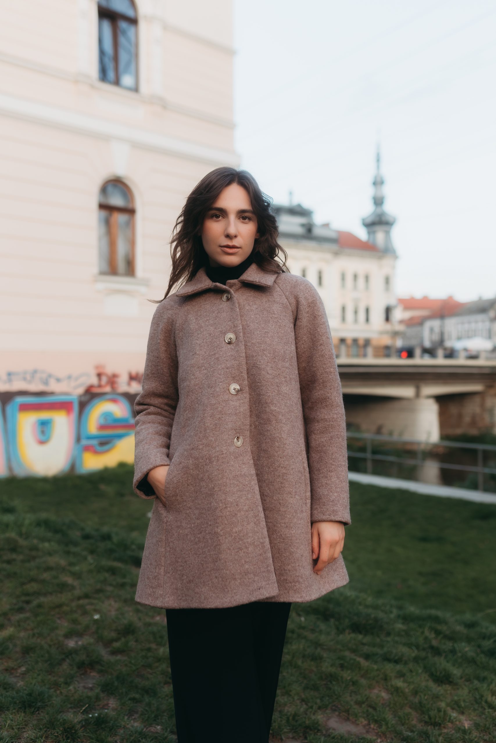 Palton cu croi clasic, în A, din 100% lână fiartă, dublat cu căptușeală matlasată. Creat sustenabil în atelierul nostru.